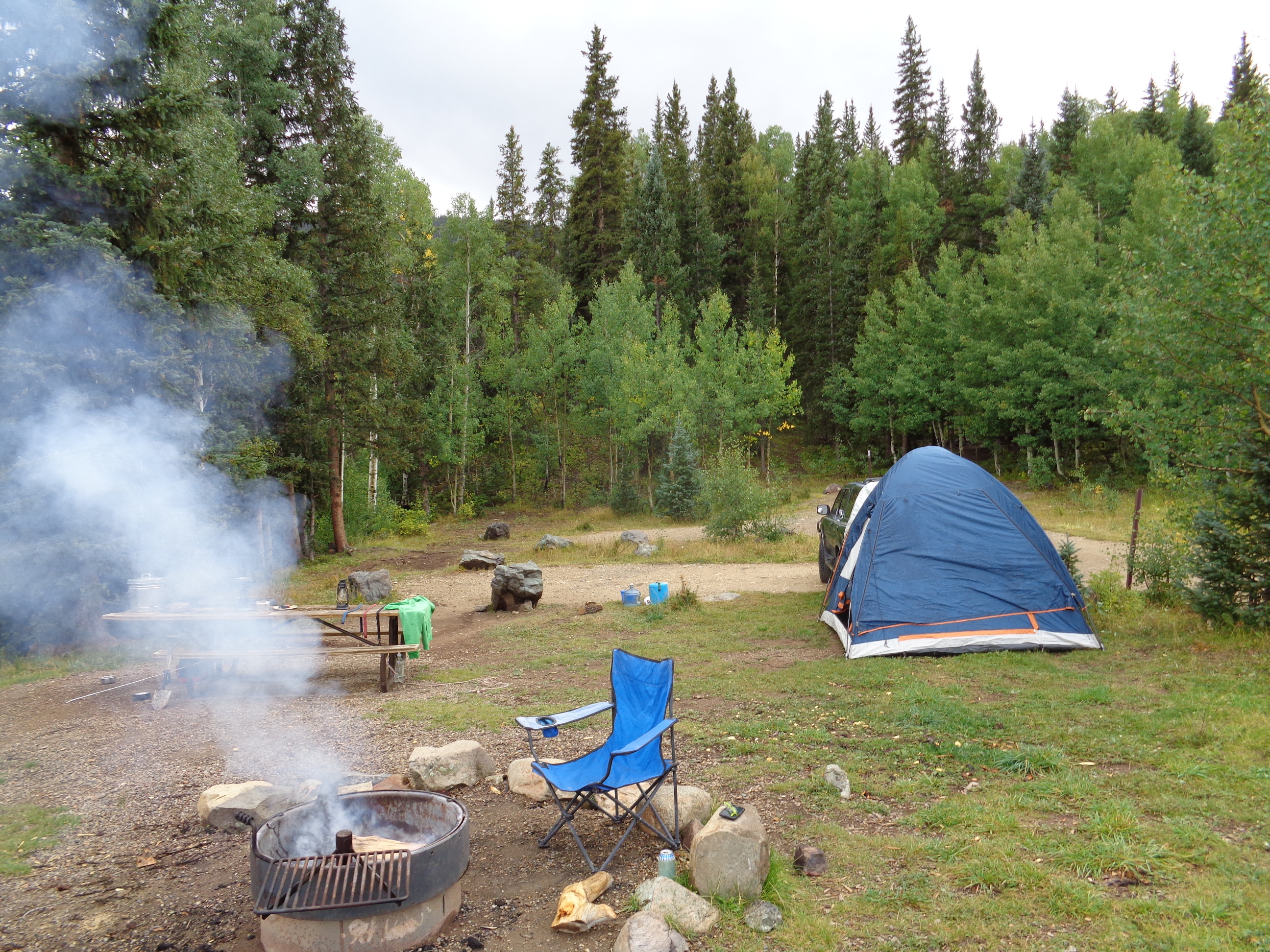 We finally found the turn off for FR 380 that would take us to Stunner Pass Campground, a primitive and free NF campground with only 5 sites. I hoped it’d be open for us even on Labor Day weekend. We were lucky. I picked a site above the river, surrounded by trees behind and with a killer view of the mountain pass to the north of us.