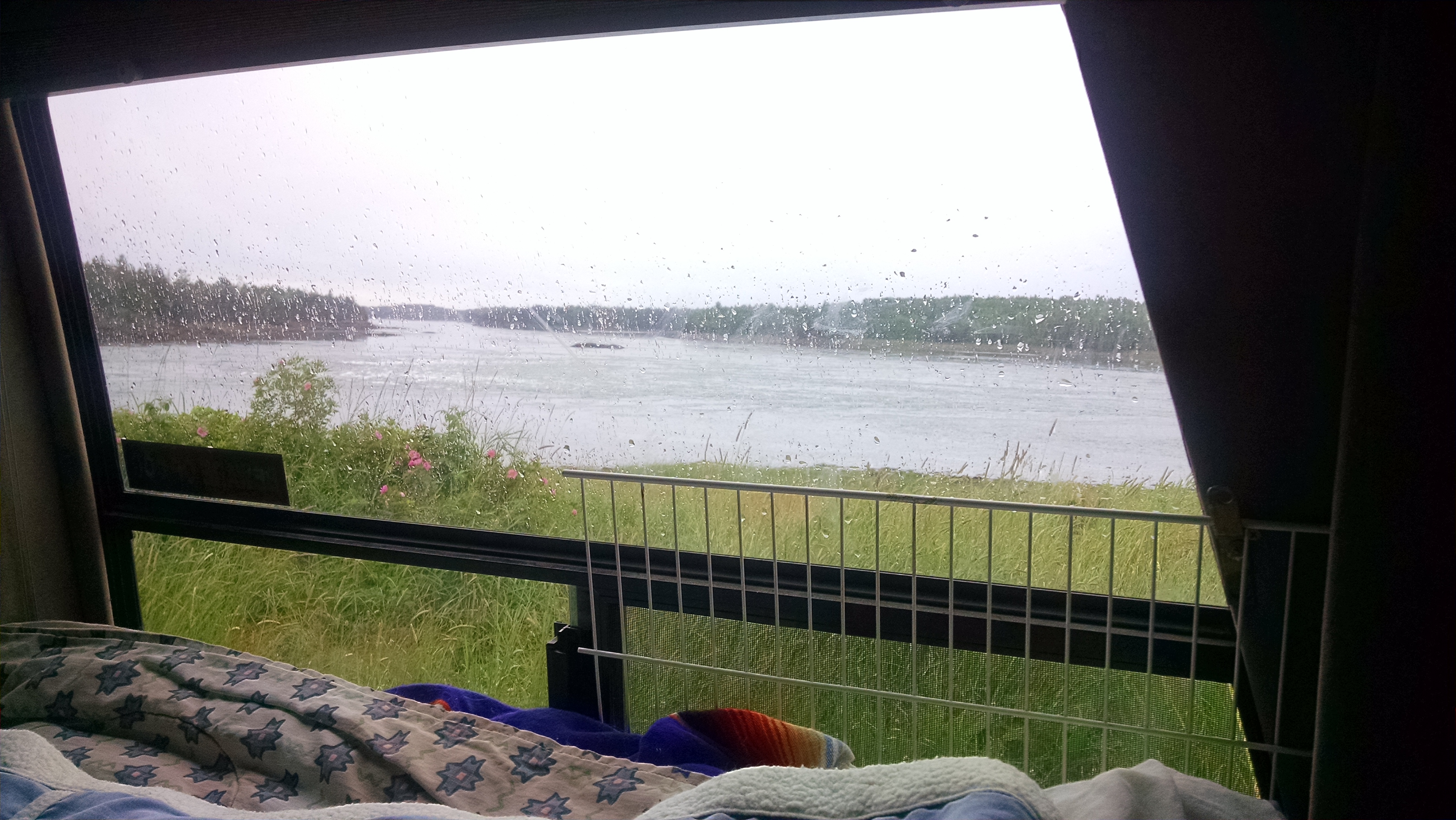 Back on track, the rain splattering on the windshield, the morning passed slowly as we headed north. With a picnic in a layby by the rivers and estuaries, my tension eased. The sky remained mostly dark and dismal but we were comfortable in the van. Cozy even. Stevie lay on the bed with Rosie as Harold’s claimed the passenger seat these days. I read a little, drove a little, and drank multiple cups of coffee. Finally, all 80 miles later, we reached Pembroke. Turn right down a local road with no signs and follow that for another five or so miles. Reversing Falls Park is the goal.