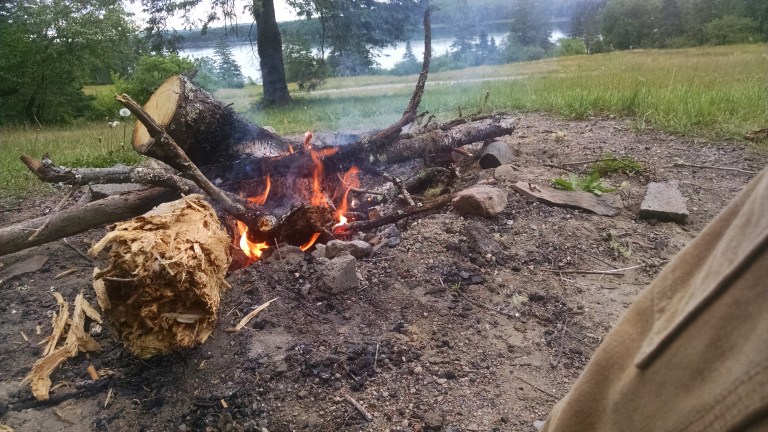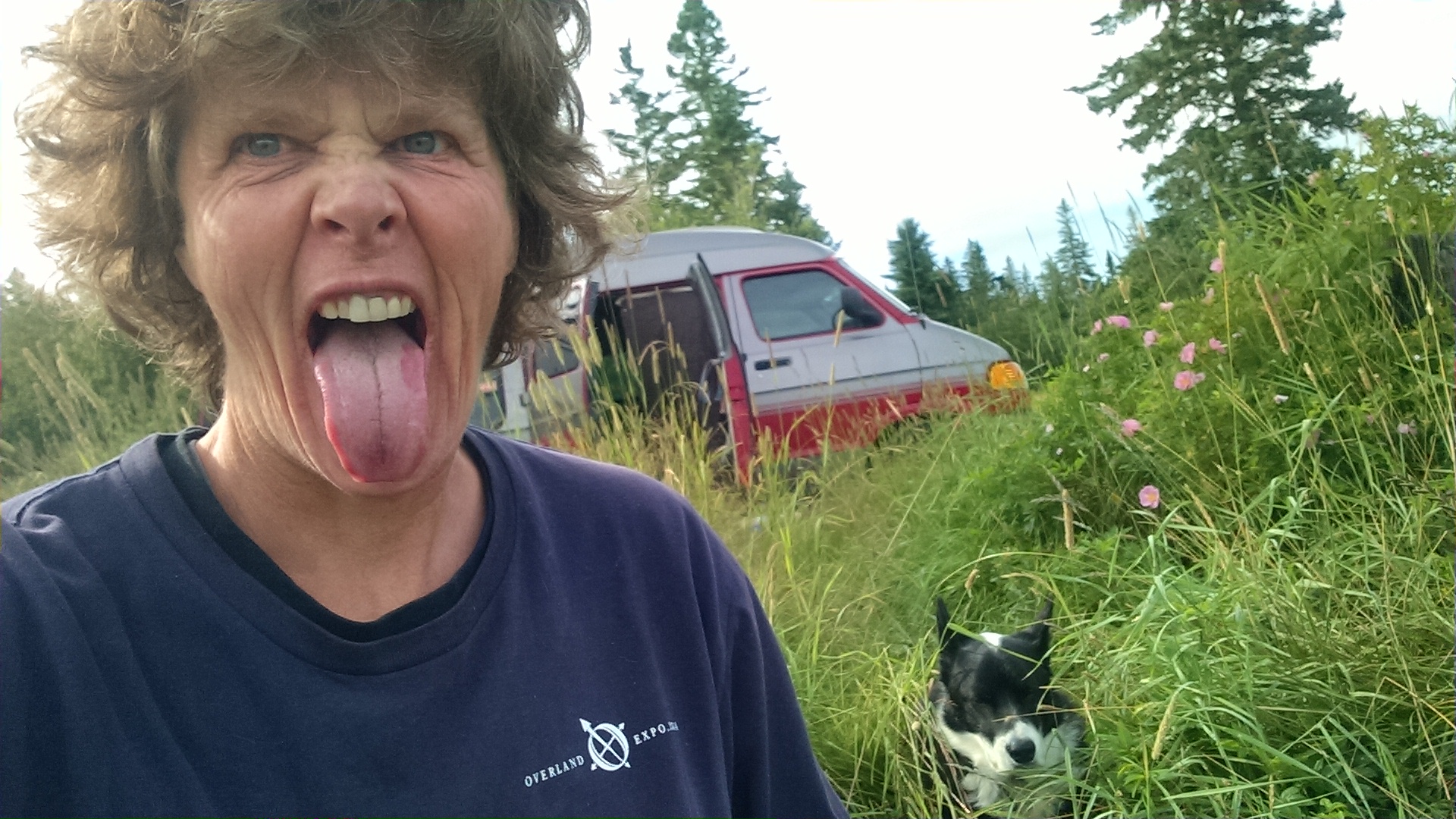 Reversing Falls is empty and this time I’m able to set us up in the trees uphill from the waterfront, overlooking the islands and Cobscook Bay to the east of us. With low grass, big trees and good sized firepit, this is a good place to stay for a few days. The weather holds and so with doors open, the critters lie in the sun and shade. I read, drink, then nap. Rosie sleeps most of the day prefering the van. Harold picks the biggest bone and wanders off on his own. The day passed easily although the threat of porcupines kept my adrenelin levels high. The beer helped with that.